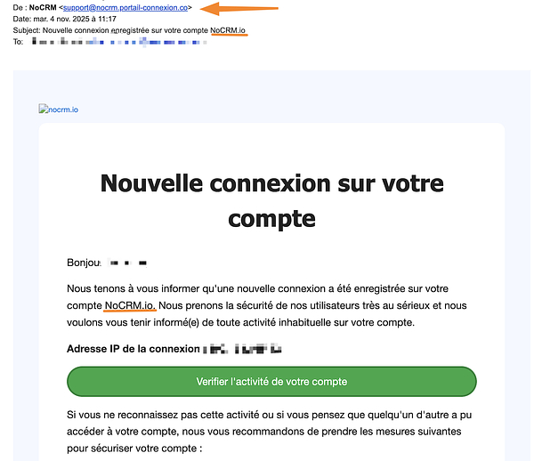 Wenn Sie eine E-Mail erhalten, die angeblich von noCRM stammt, aber von einer anderen Domain kommt, klicken Sie auf keine Links und geben Sie keine Zugangsdaten ein.