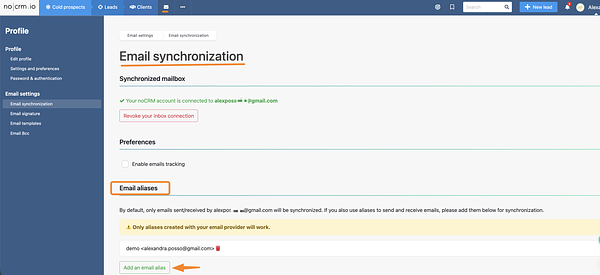 Les alias doivent être créés avant depuis votre fournisseur d’email principal (Gmail, Outlook, etc.) de les ajouter dans noCRM. Si l’alias ne redirige pas réellement vers votre boîte principale, il ne fonctionnera pas.