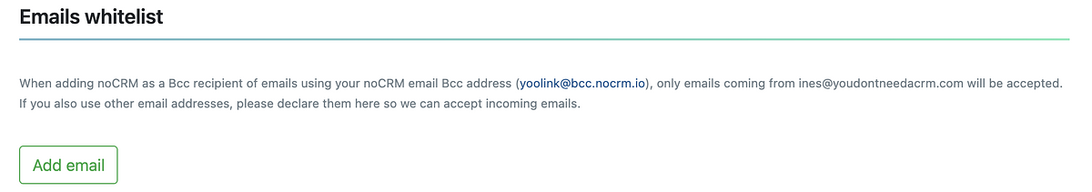 Si vous utilisez différentes adresses e-mail pour écrire à vos prospects et leads avec la fonctionnalité e-mail 2-way ou Bcc, vous pouvez créer des alias d’e-mail ou mettre en liste blanche des adresses e-mail dans votre compte noCRM afin de pouvoir les utiliser sans interférer avec la bonne expérience utilisateur du service.
