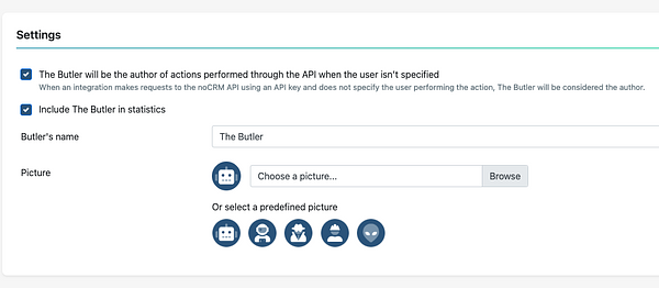 All automated actions are performed by a special system user called The Butler, ensuring that your reporting and activity history remain clean and accurate. You can personalize it from the Admin Panel > API & Automations > The Butler