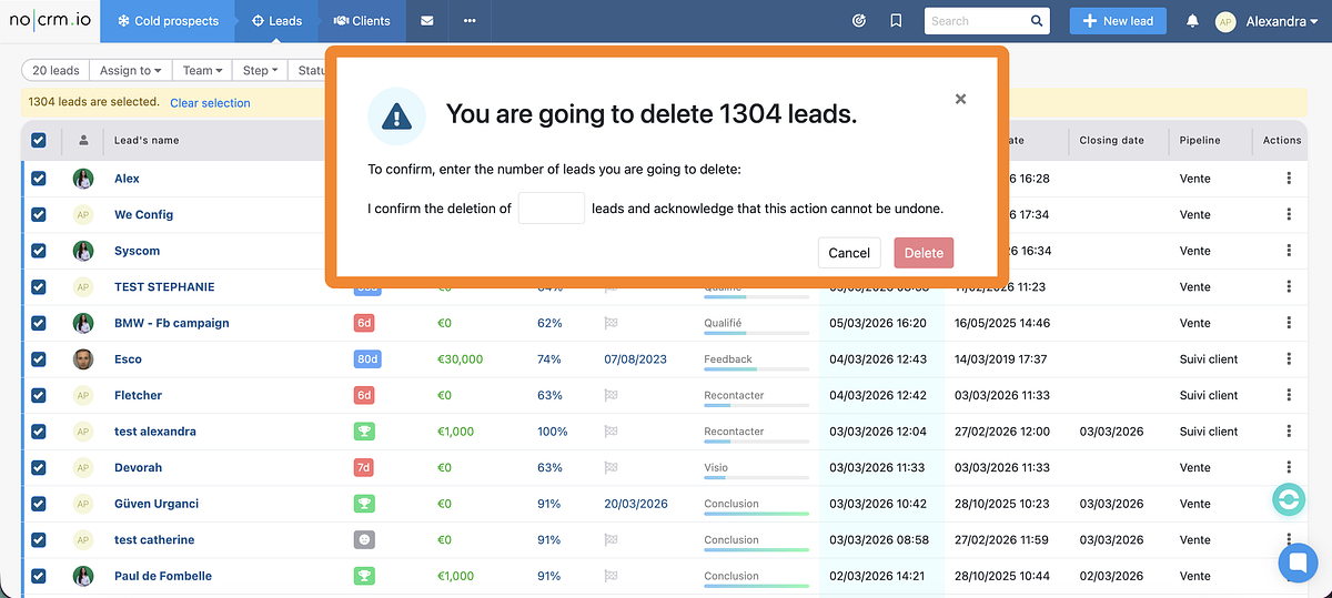 Ao gerenciar seus leads, muitas vezes você precisa alterar massivamente sua etapa no pipeline, atribuí-los massivamente a outro usuário ou até mesmo adicionar ou remover tags. Dentro do noCRM.io, você pode fazer isso facilmente para gerenciar com eficiência seu processo de vendas.