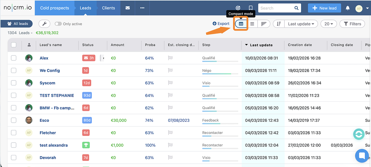 Para fazer ações em massa com leads, é tão fácil quanto escolher o "modo compacto" de visualização de leads.