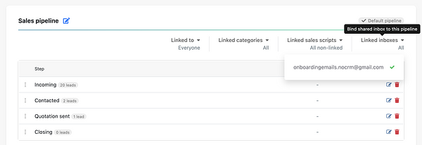 - Acesse a seção Etapas de pipeline no Painel Admin e selecione, para cada pipeline criado, qual(is) caixa(s) de entrada compartilhada(s) deseja vincular. Assim, nem todos os usuários verão todas as caixas ou emails, caso não seja o desejado. Além disso, será possível enviar e receber emails apenas nos leads dentro do pipeline vinculado.