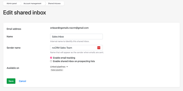 Para configurar a Caixa de Entrada Compartilhada, você precisa ser administrador e conectar o endereço de email da sua equipe (exemplo: vendas@suaempresa.com) à sua conta na noCRM acessando Painel Admin > Caixas de entrada compartilhadas. Em seguida: